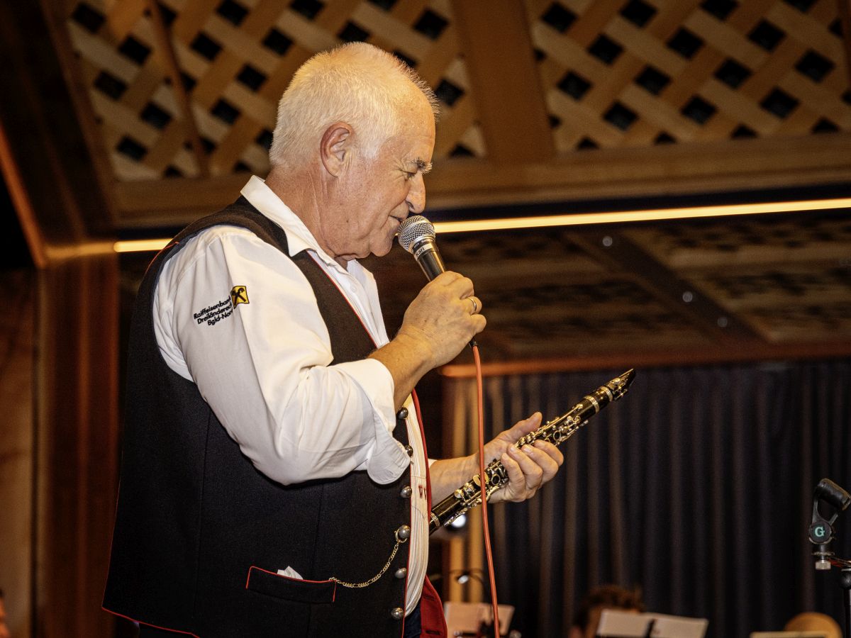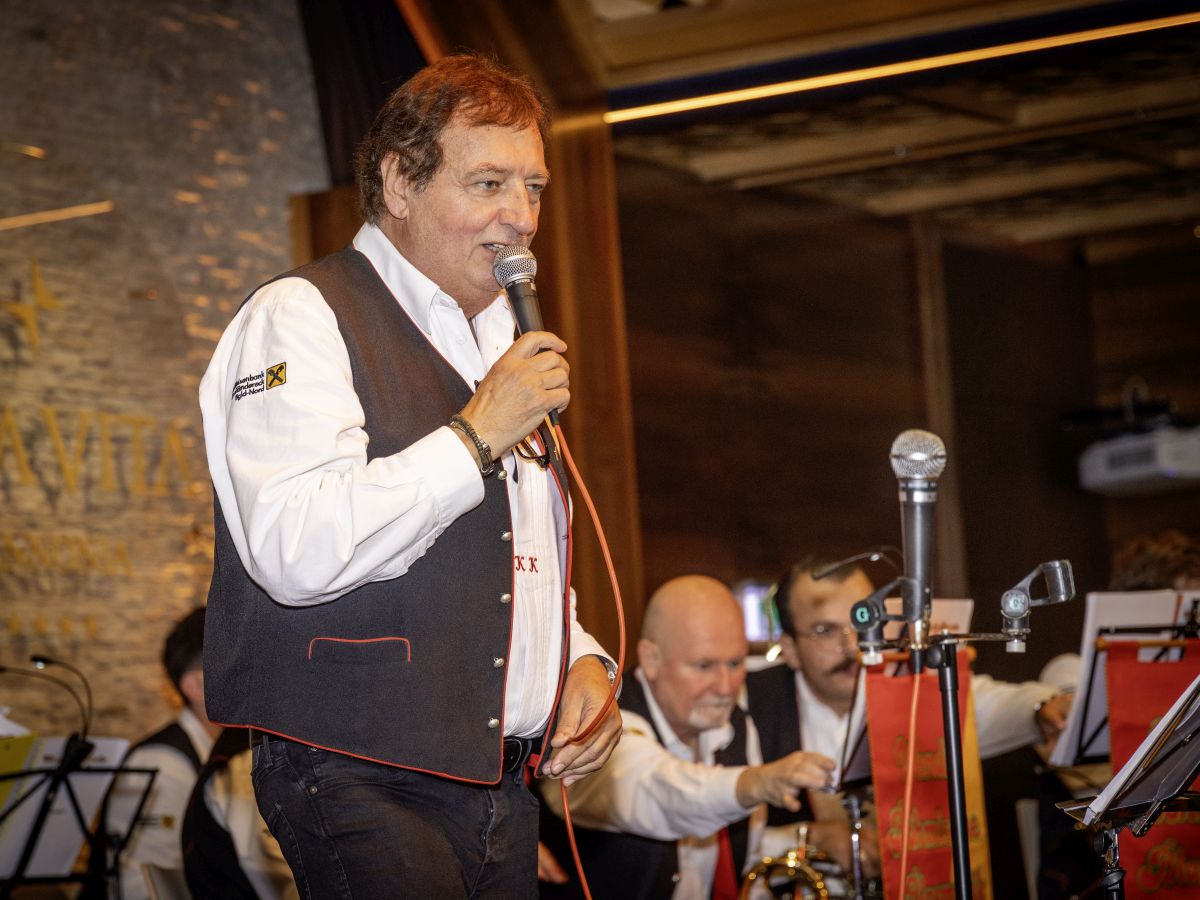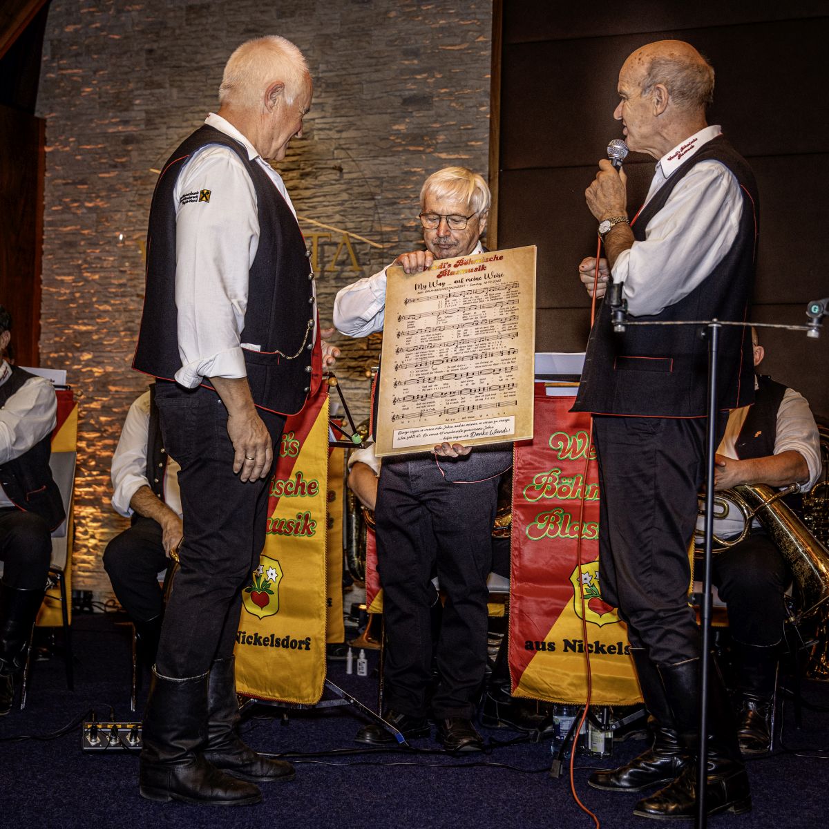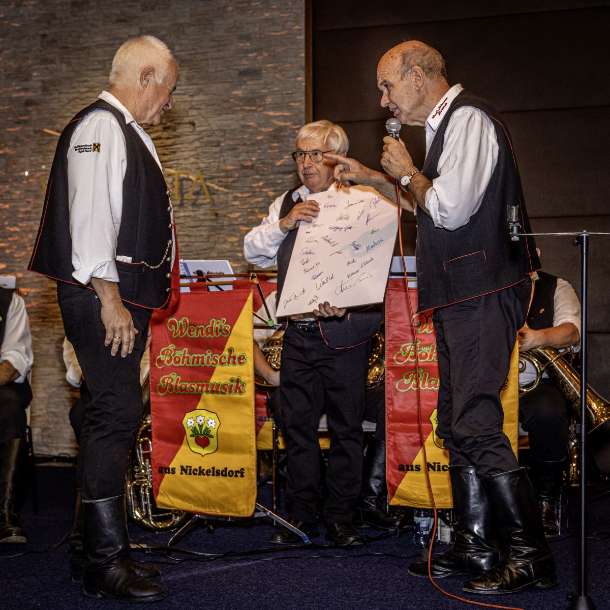 Die Geschenke der Musikanten waren schlichter, aber nicht minder herzlich. Obmann Erwin Himmler überreichte nach einer bewegenden Ansprache einen Gutschein für VIP-Tickets zu einem Konzert des Wiener Mozart Orchesters – inklusive Gourmetmenü im Hotel Imperial, Fiakerfahrt und Begleitung durch einen Mozart-Pagen. Und dann kam jener Moment, der alle Herzen berührte: Die Kapelle spielte den Sinatra-Hit "My Way" – mit einem eigens auf Wendi zugeschnittenen Text, gesungen von Karl Kanitsch. Als diesem während der ersten Strophe bereits die Tränen der Rührung in die Augen stiegen und er Wendi zu sich bat, um das Lied gemeinsam vorzutragen, wurde die Bühne zum Ort purer Emotion und jedem war klar: Das kann Hollywood auch nicht besser. Zwei Freunde, zwei Weggefährten, zwei Stimmen im musikalischen Gleichklang, vier Augen unter Tränen – ein Moment, den niemand je vergessen wird.