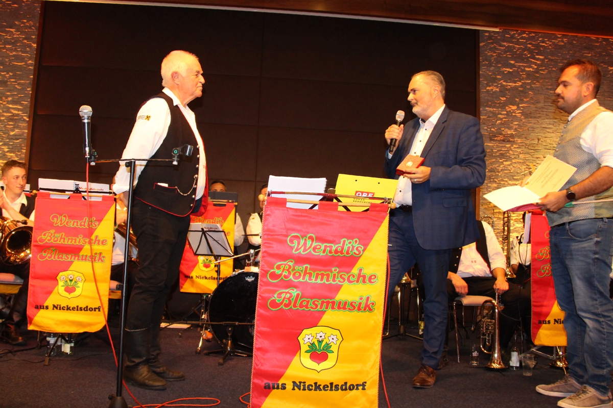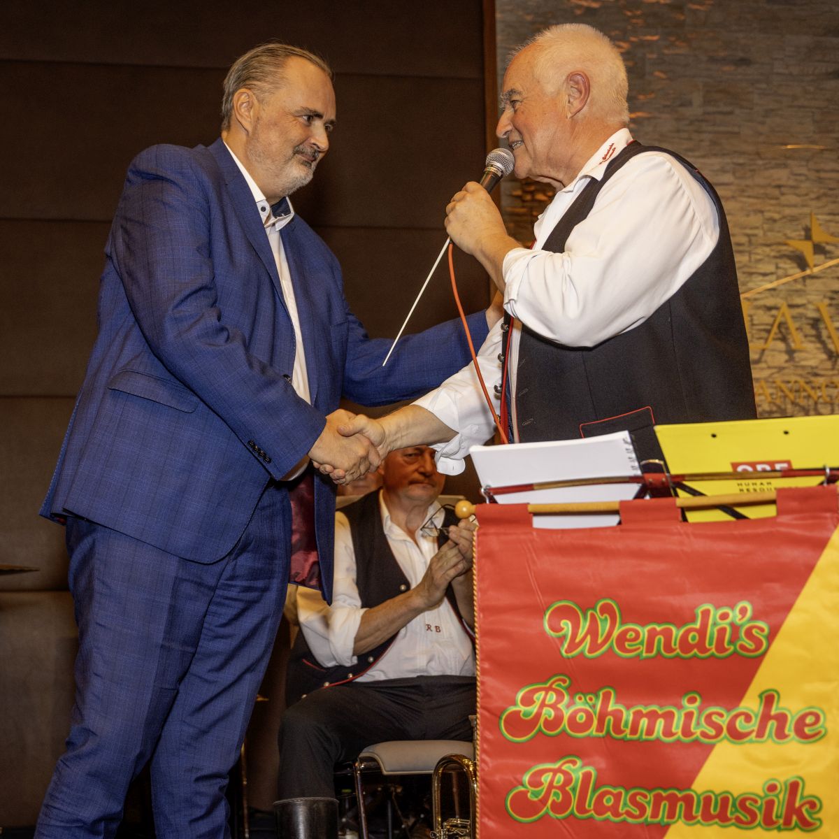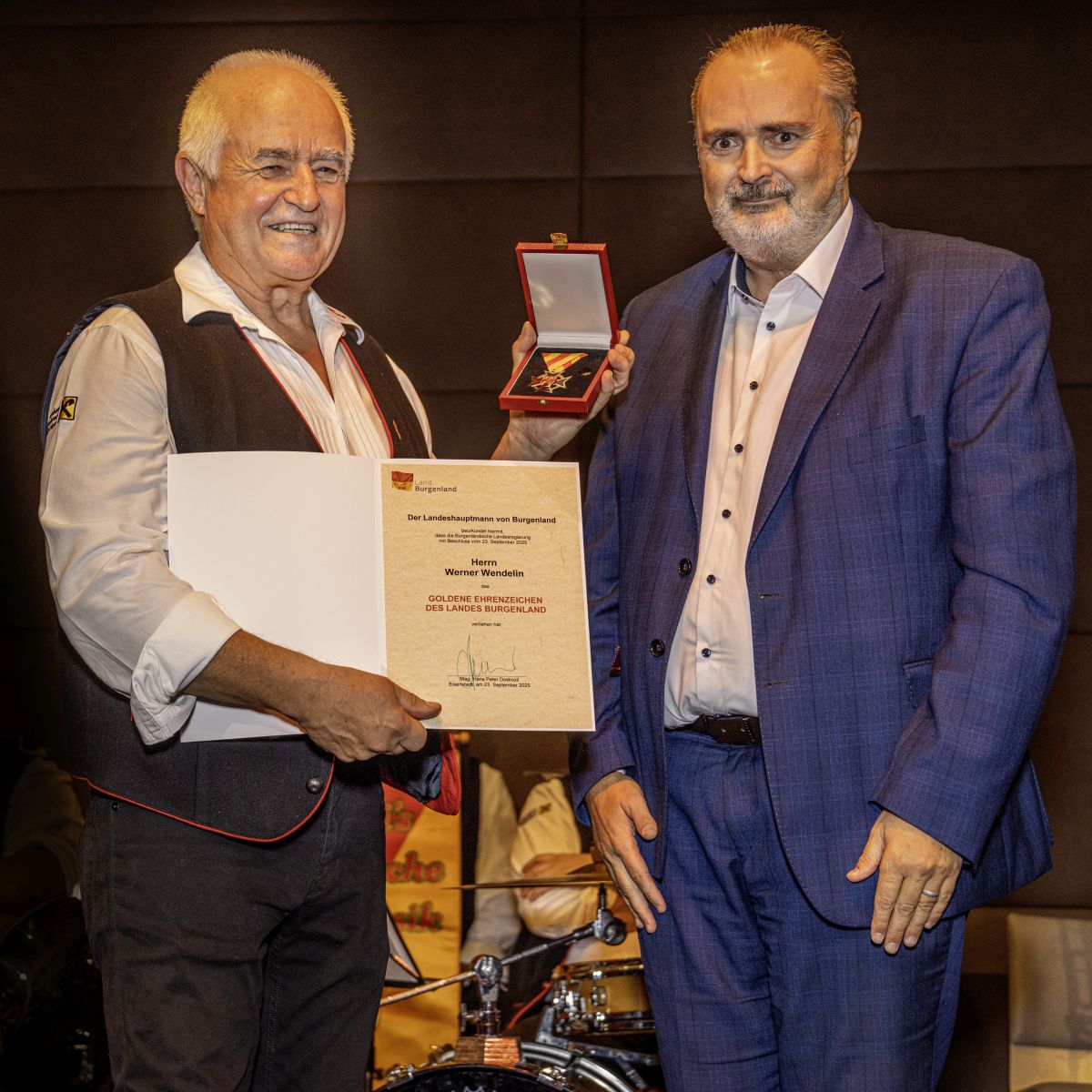 Wie hoch Wendis musikalischer Stellenwert zu bewerten ist, zeigte sich eindrucksvoll beim Abschiedskonzert: Landeshauptmann Hans Peter Doskozil würdigte seine Verdienste um die Blasmusik mit dem Goldenen Ehrenzeichen des Landes Burgenland, als ein sichtbares Zeichen des Dankes und der Anerkennung. Im Gegenzug durfte sich das Landesoberhaupt im musikalischen Handwerk üben und den Taktstock zum Marsch "Kaiserin Sissi" schwingen.