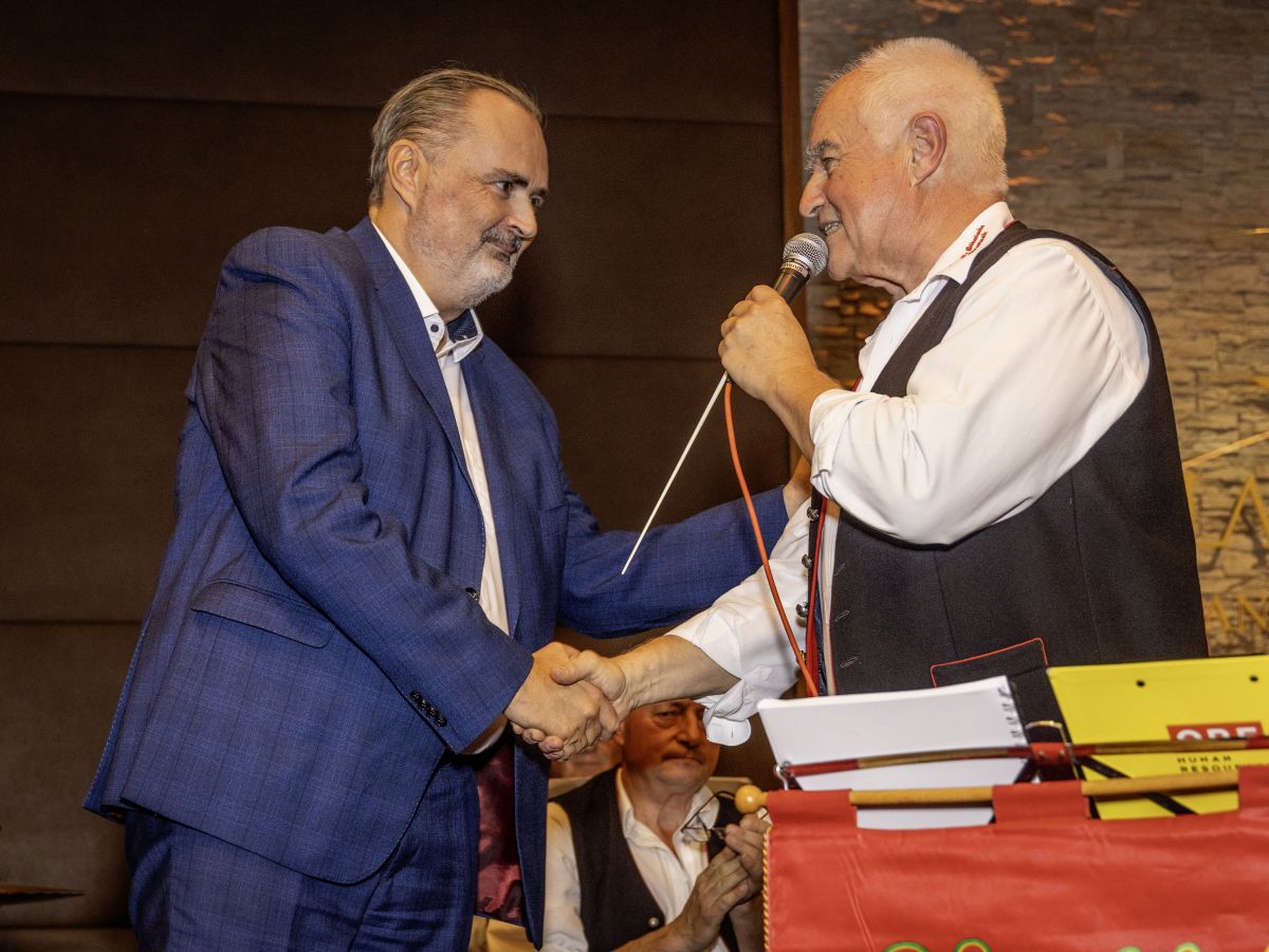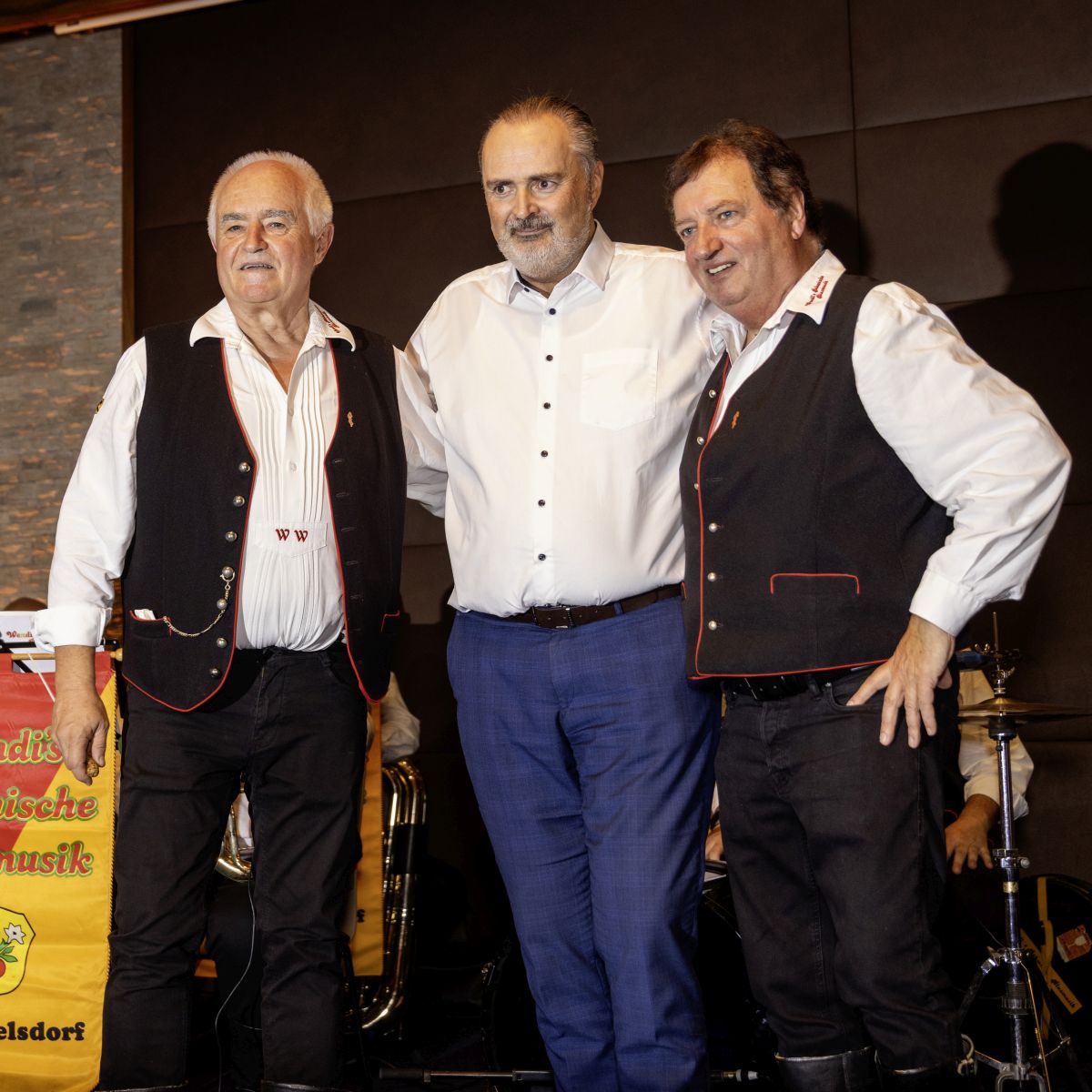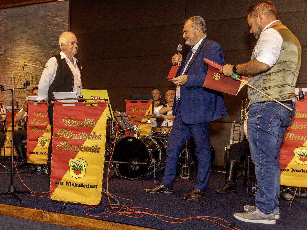 Wie hoch Wendis musikalischer Stellenwert zu bewerten ist, zeigte sich eindrucksvoll beim Abschiedskonzert: Landeshauptmann Hans Peter Doskozil würdigte seine Verdienste um die Blasmusik mit dem Goldenen Ehrenzeichen des Landes Burgenland, als ein sichtbares Zeichen des Dankes und der Anerkennung. Im Gegenzug durfte sich das Landesoberhaupt im musikalischen Handwerk üben und den Taktstock zum Marsch "Kaiserin Sissi" schwingen.